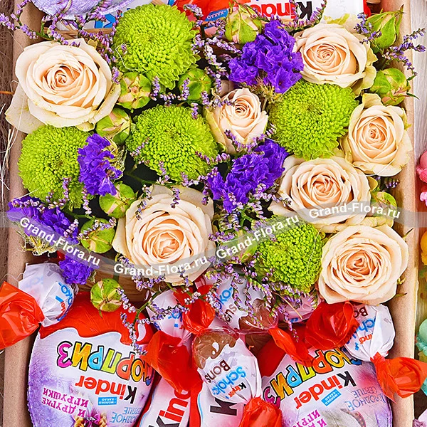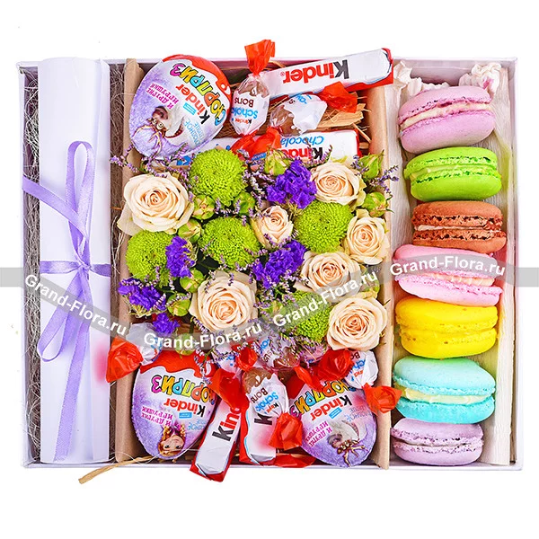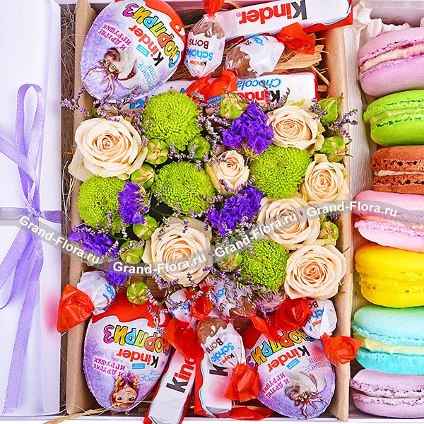 Оригинальное поздравление, в составе которого есть как цветы, так и сладости: роза кустовая белая и хризантема кустовая зелёная, вместе, создают неповторимый и стильный дуэт на оазисе, который будет радовать дольше обычного букета, милые акценты статицы отлично дополняют всю композицию в целом. Сладкие макаруны и целая коллекция продукции киндер, несомненно не оставят равнодушным ни одного сладкоежку, а эффектной завершающей нотой станет послание в письме, текст которого Вы сможете составить сами! Обращаем Ваше внимание, что состав и оформление может отличаться.