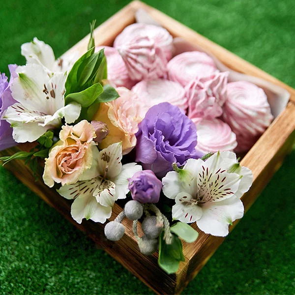 Стандартный: альстромерия белая - 1 шт., эустома фиолетовая - 1 шт., эустома персиковая - 1 шт., зефир, декор, оазис, деревянная коробка.